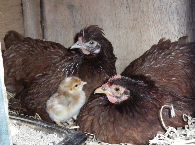 And last but not least, the chicken saga continues; I have had two broodies sitting for 6+ weeks. I didn’t think they’d stay put at first because it was so cold, so I didn’t arrange any hybrid chicks for them. But they sat it out, and just over four weeks ago, I was at a friend’s house who keeps a cock bird, so I begged some hopefully-fertile eggs from her and popped them under. But sadly, one of the broodies at least was turfed off the nest by someone looking for a space to lay in sometime in the first few days, and when I candled the eggs at 7 days development, two were obviously clear. I couldn’t see much in the other two because they were blue eggs, but one did look a bit darker – maybe it had a thicker shell? Anyway, day 21 came & went with no hatchlings, then day 22, day 23, etc. I was a bit worried that they’d starve, so on day 27, the first day I had any spare time, I rang round the local breeders, located one (Race Farm Poultry – thank you, Shelley!) with day-olds, and went & bought 4 best-guess-female pure breed chicks for them.