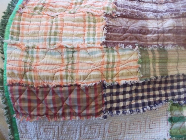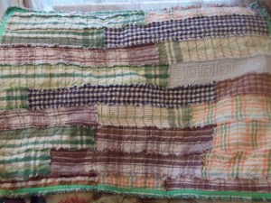 …that the next one would be made entirely with recycled materials. And here it is! Old seersucker tablecoths, and a couple of shirts, to be precise. All gleaned from charity shops or the Tip; the batting is a fleece baby blanket that someone had no further use for, although it was as good as new & could easily have been donated to a charity shop. But it wasn’t…  The thread (two colours only) was rescued from old sewing machines or sewing boxes & was still strong, the backing & self-binding was a length of calico that used to line our kitchen curtains and the ribbon came from a whole roll that turned up in a Freecycled sewing box.  It’s a cot-size “strippy-raggy” quilt, for want of a precise description! Fun & very quick to make, but also very textural & soft from a baby’s point of view.