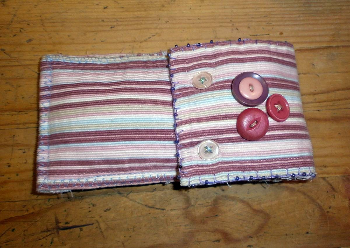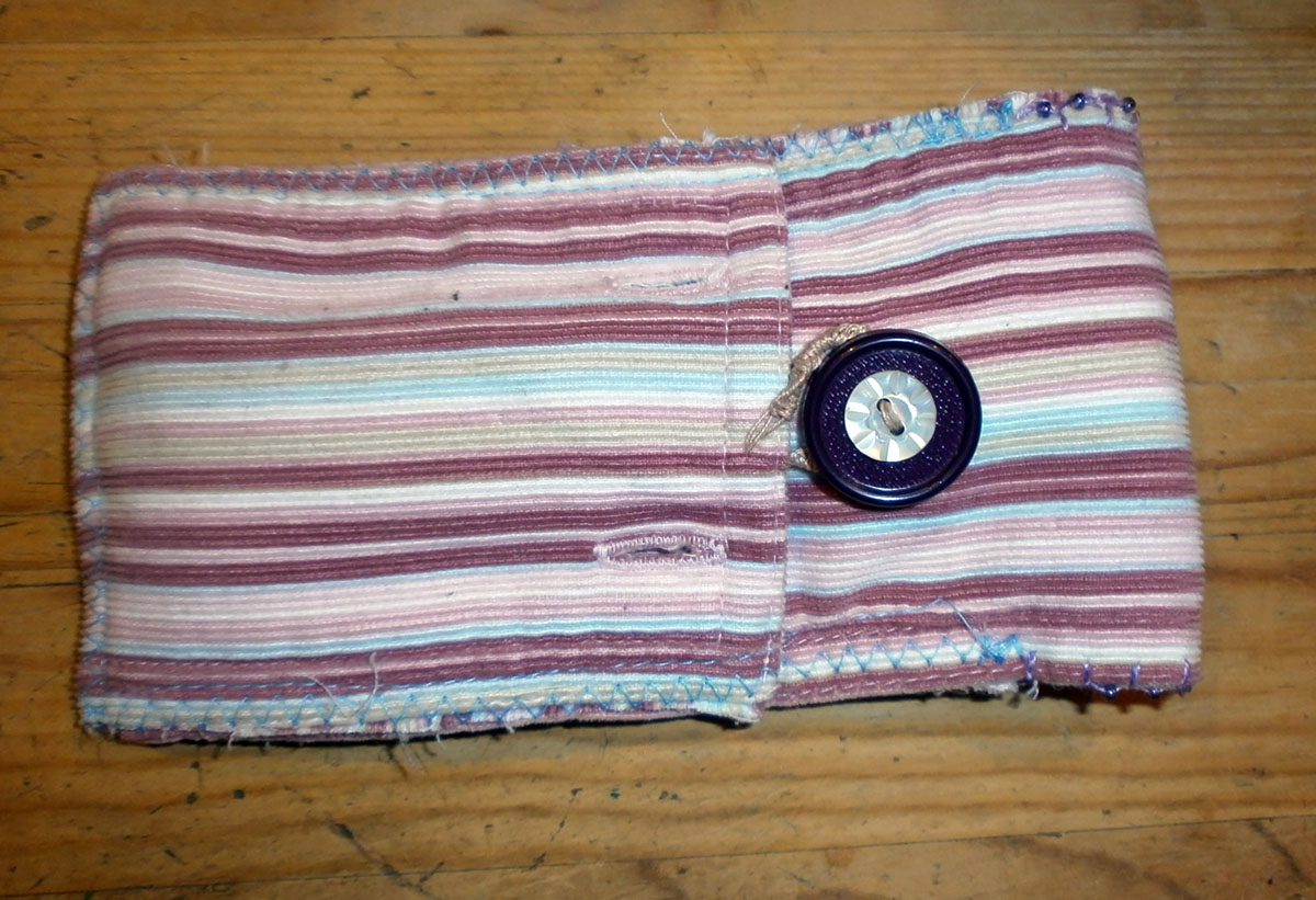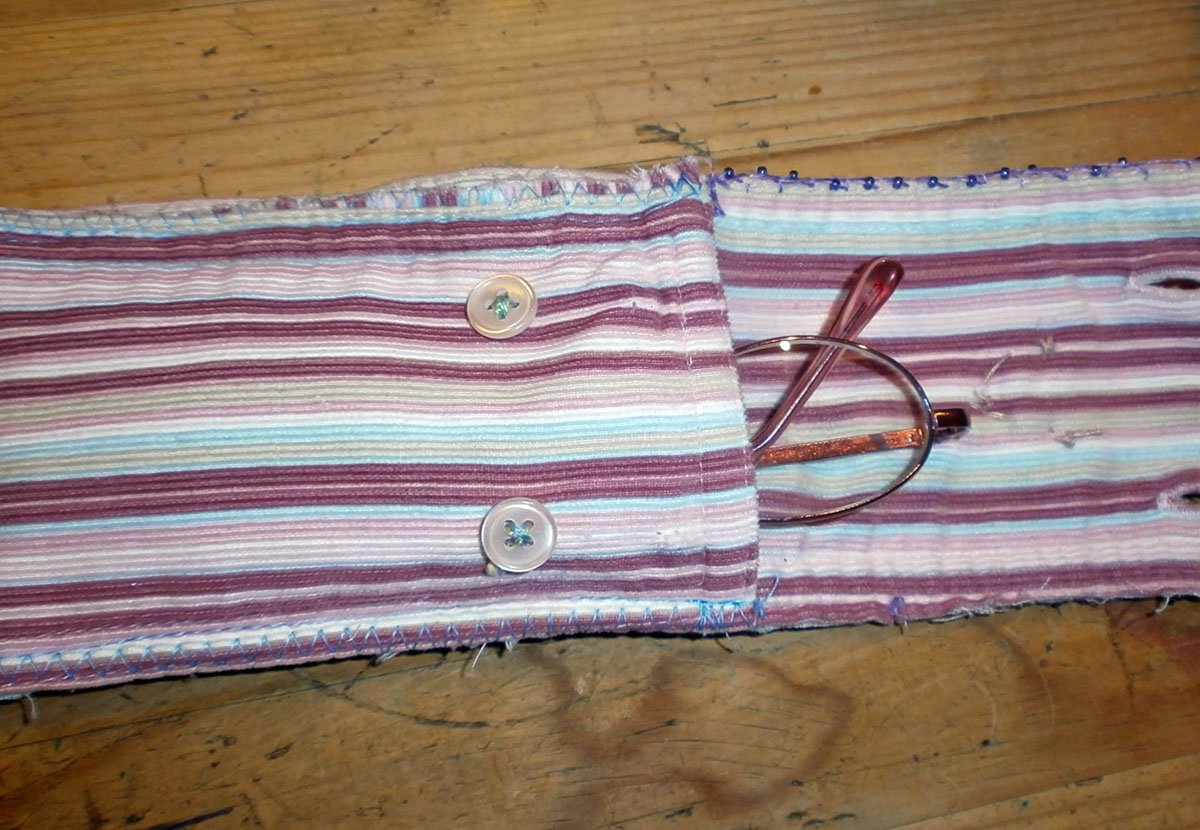 But today I cracked it; I found a nice “Next” pink striped needlecord shirt for £1 on Monday, that you’d have to have an incredibly slender & well-sculpted figure to wear. I could see straight away that it’d make several stunning fabric hearts, or possibly needlecases; maybe some of each. As I was cutting it up today, the cuffs fell together onto the tabletop in such a way as to remind me I’d lost my glasses case recently, and suddenly I could see how I could make them into one, very quickly & easily. And 20 minutes later, my glasses had a new home! It even has a useful little pocket on the back, too, that I’m going to make a tiny matching mending kit for. Will post a “how-to” sometime after weekend!