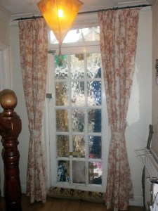 Sorry, but I’m not actually going to shut up yet… really it’s now the final curtains, the last one from the Laura Ashley set, lengthened with the strip cut from the conservatory ones & made into a pair for the front door. It all looks rather posh now! I’m amazed how quickly it all happened; it’s almost as if they wanted to be used rather than being sent off for ragging, because despite the sheer weight of the fabric and the fact that half the time I was finger-pressing rather than doing a proper job with the iron, somehow I hardly put a stitch wrong & my quick-unpick was only used to remove the header tape, which was then re-used. So now I have three pairs of matching warm, lined curtains, which kind of fit nicely in a house this age & size, for the princely sum of £3.50 – one of the 50p curtains poles was not needed so went off with a friend, but I had to buy a few more pin-hooks to hang the last set as the rings on that pole are metal. One reason why the old curtains looked so tatty was probably that one of them only had two pin-hooks left; the rest of the rings were attached with a motley selection of safety pins!
