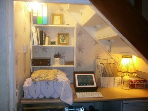 Not sure I can quite believe it! It’s not “finished” & I’m not sure it ever will be, any more than any room in any living home can be; there’s always something new to accomodate or something different to be done. But when I say “new” it’s a relative term; nothing in there has been bought new, except the network printer (under the embroidery) which we’ve had for nearly a year. Even my Ipad, which has also been with us for a while, was a refurb. And I have stuck to my guns and not spent one single penny; it’s all been done with stuff we already had!