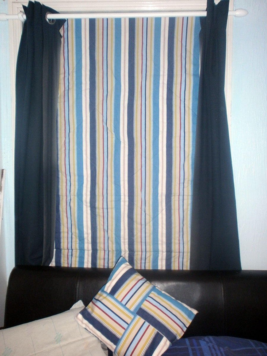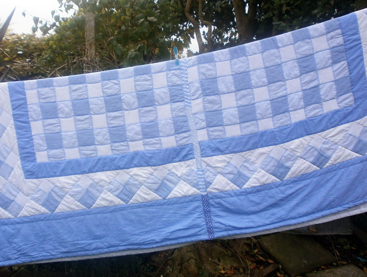 This quilt came to me in two pieces; I found it in a local charity shop (henceforth referred to as CSs) just after I’d promised a young friend a quilt for their birthday. It’s a commercially-made one, although it’s hand-pieced, probably in India, and had been cut in half & hemmed to make two small singles, probably for two small boys. The two halves were being sold for dog blankets at £2.50 each… just so happened that I was cutting up a pile of blue 99p CS shirts to make patchwork pieces, and I couldn’t resist the temptation to “cheat” and try to join it back up again; couldn’t help thinking it would be rather wasted on your average pooch. I doubt I could have done it invisibly and actually I didn’t even want to try; every quilt tells a story, as they say, and being divided & joined back up again is part of this quilt’s tale. It lies flatter than it looks on the washing line!