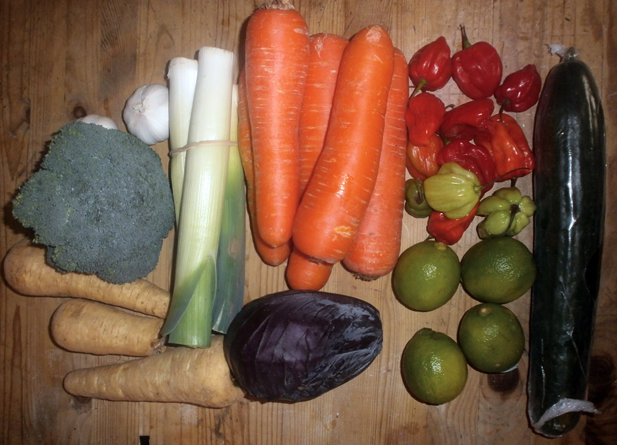 Those carrots are enormous, by the way, at least 30cm long each, and very tasty; the cucumber is a perfectly normal size! And last week I was given a carrier bag full of tomatoes which wouldn’t last, which made a huge pot of delicious tomato soup that made lovely lunches for all of us who study or work from home, all week.