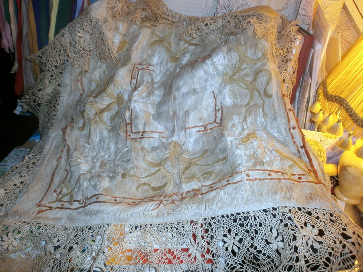 Some of it is literally shredding in our hands; for example the silk/glazed cotton/lace cushion cover above, which is most likely French (there’s another one, in even worse condition, with Souvenir de France embroidered on it. A good clue as to its origins, I feel!) where the cotton backing & lace are intact but the weft threads of the cover have just gone to dust; the warp threads are all that’s holding that embroidery together. The baby bonnet, which is the piece I recognised from the old shop, is also shredding to dust as it’s handled; several years crumpled into sealed black plastic binliners in a hot loft have not done much for the development of age-stains & mould spots, either. It’s a shame to touch it & hasten its decline and I feel quite inadequate to the task of trying to preserve what’s left in decent condition. But I suspect it would just end up at the Tip otherwise, if unsold. And I know that the old lady, and the untold hundreds of stitchers behind her, stretching back at least as far as 1800, would be far happier to see what remains of their exquisite work being used & admired, even if that means cutting it up to remake into something new, than made into J-cloths & used for wiping sinks.