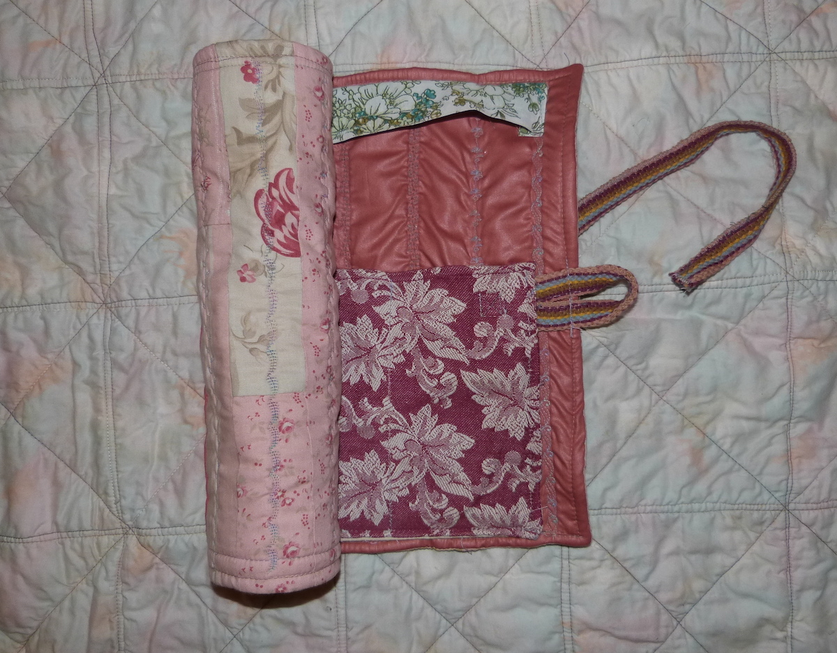 Big scrappy needle roll, with space for scissors, patterns etc.