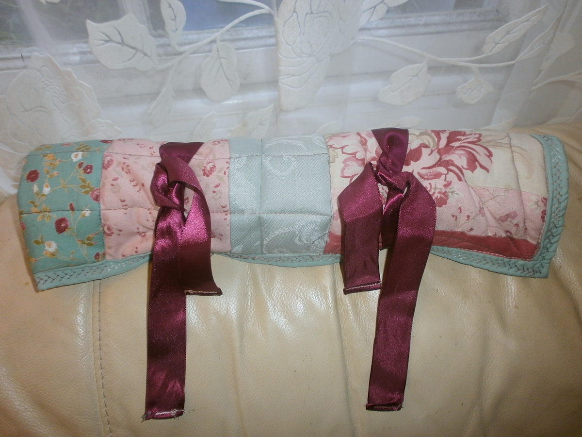But there were bits left over… another friend had recently asked me to find her a knitting needle roll, and as she’s been kind enough to give us 3 beautiful budgies over the years, I thought I’d like to make her one to say thank-you. So the little left-over bits got themselves made up into this one: