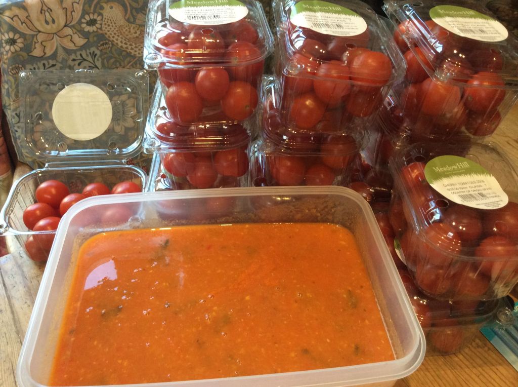 Today’s bargain was 18 x 350g punnets of Spanish cherry tomatoes for £3, i.e. 6.3kg, just tipping slightly into over-ripe territory. That’s quite a few… so far I’ve used 6 punnets in a big pot of tomato & coriander soup, along with two of the 8 courgettes picked at the allotment yesterday and one of our home-grown onions that had got a little bruised on harvesting. One more punnet has gone into a chilli this evening, leaving me with 11 to go. I was musing about whether to dehydrate some – still a possibility – but my Other Half’s face lit up at the mention of Tomato & Chilli relish. So that will be tomorrow’s major project, after producing our traditional Sunday roast dinner.