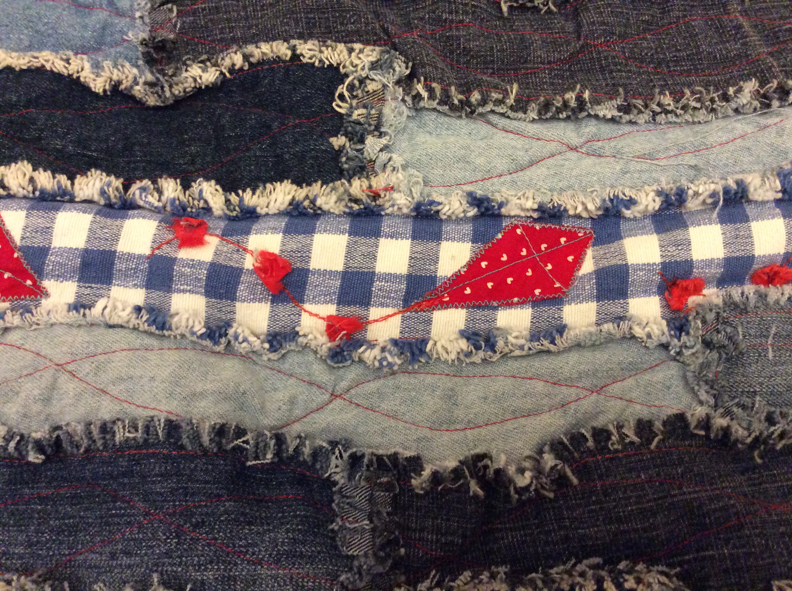 Lesson 2: some jeans are fairly lightweight, others are – not. The difference in fabric weights means some “bricks” are “dominant” when it comes to chenilling, and look bigger in the finished article. And the heavier-weight fabrics are just that – heavier – and my shoulders were aching like mad with all the pushing & pulling by the time I’d finished quilting it very roughly. Next time I have an urge to use denim in an actual quilt, it’ll be lightweight, non-stretch shirt & skirt fabric only!