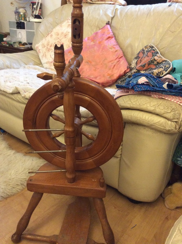 I’m sure there was something serious I wanted to witter on about, but I’ve entirely forgotten what it was, thanks to finding most of a treasure at the recycling warehouse earlier this week. A 1979 Rappard Wee Peggy spinning wheel, originally from New Zealand, but alas, she’s missing her flyer, whorl & bobbins. So that will be a Quest for me over the next few months; I either need to track some “orphan” parts down, or find something that can substitute for them. Without them, sadly she’s just expensive firewood; with them, she’s a beautiful and genuinely useful tool.