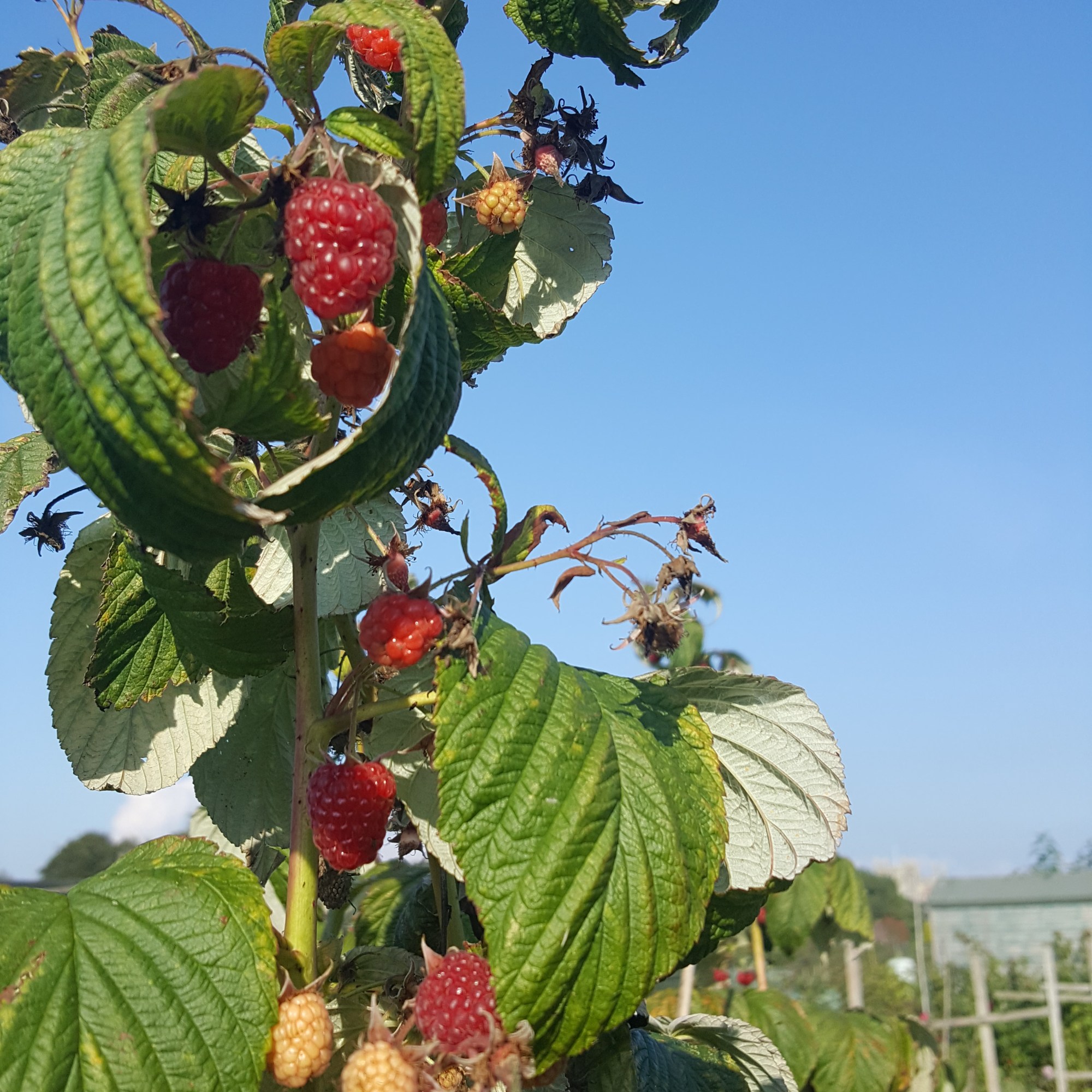 “Another 850g of raspberries brought home this morning, along with a bag of just-popped-up spuds, enough beans for a meal for 5 and a courgette, plus a load of cabbage outer-leaves for the Girls (the chickens, rather than my daughters) from my neighbour, who’s clearing his plot for the winter – he will be rewarded with half a dozen eggs! I keep my plot producing over winter where possible, feeding the soil with mulches rather then resting it, and am currently planting mooli, overwintering onions and broad beans, with garlic yet to go; the kale, leeks (if they ever get any bigger!) and chard will keep producing right through.