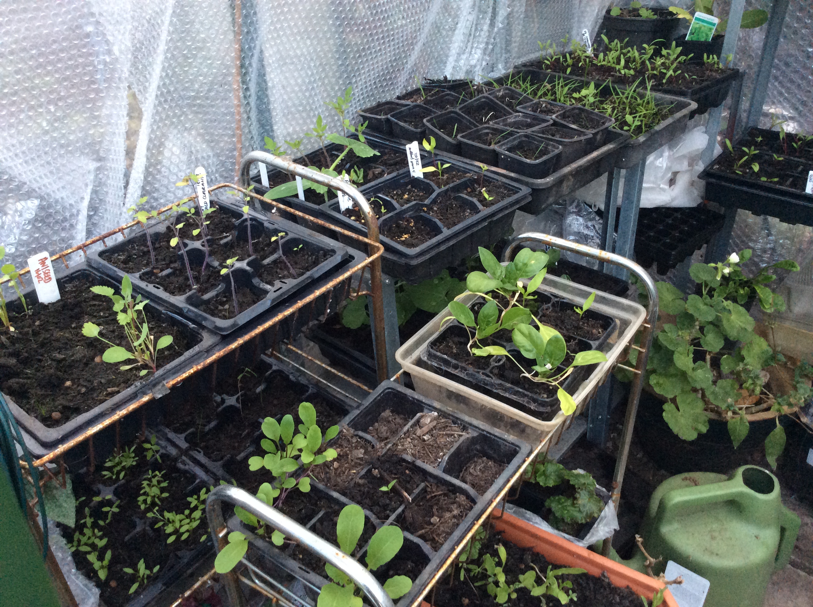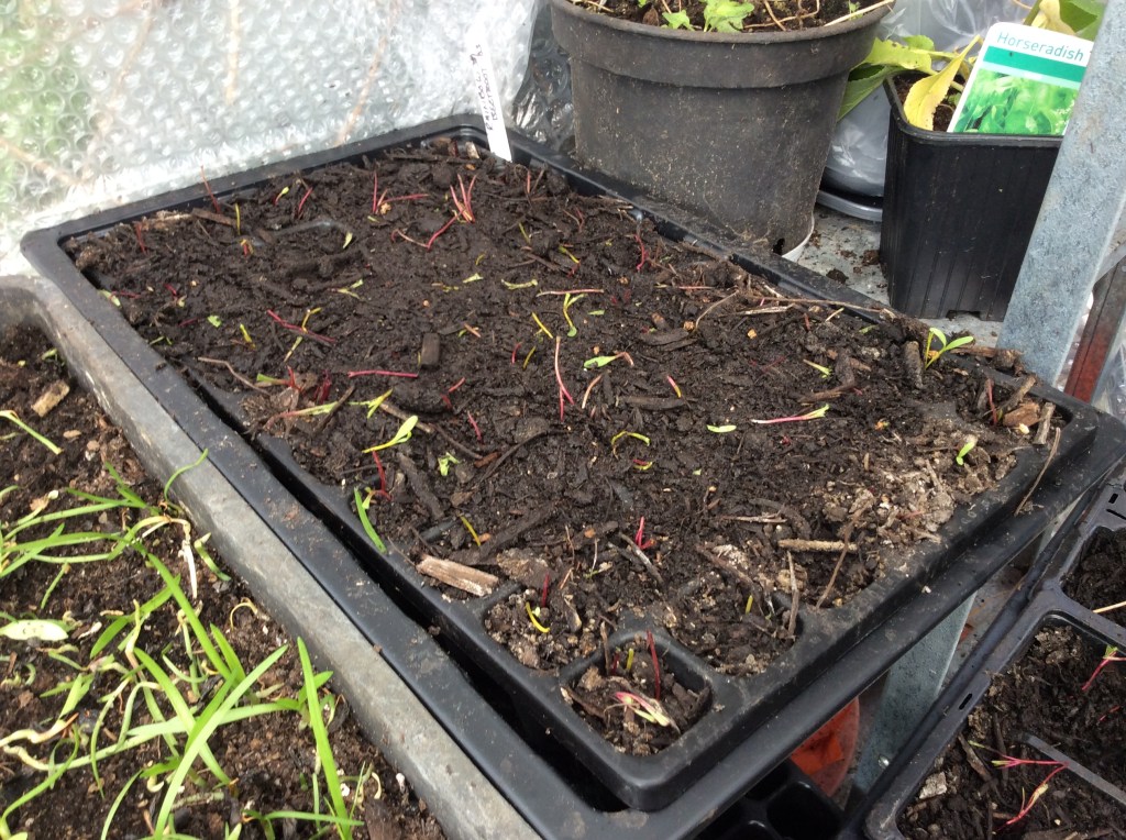 On Thursday – devastation. Utterly wrecked. It looked as if a bunch of pirates had held a wild, wild party in there; the little plants had been trampled, been pulled up & strewn around, had their heads bitten off & left lying, grazed off. Random holes had been dug in seed trays, pots knocked over and tray lids sent flying in the quest to consume or just obliterate the contents. I could have wept; the devastation was pretty much total, except for the peppers & chillis on the top shelf & for some reason, the peas & beans. 2 trays of beetroot seedlings (my husband’s favourite) more than half of my tomatoes, aniseed, Russian Blue chives, Tuscan egg onions, Magentaspreen, Russian Tarragon, agapanthus, agastache, my daughter’s spinach & named-variety sunflower seedlings – all gone, or damaged beyond hope of survival.