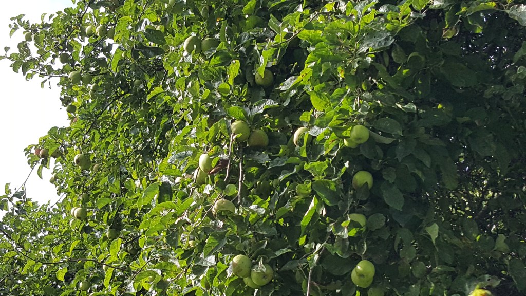 And on my way back over the bridge towards home, I spotted that the roadside apple tree on the southern side has excelled itself this year; it’s literally dripping fruit. Sadly the ponies who used to live in that field and munch the apples (which are tasty enough, but rather dry) have moved on now & it’s obvious that no-one fancies eating the apples from a tree so close to a busy road. Though to be honest, most people have probably never even noticed them, except as a wasp-attracting nuisance. I adore random roadside apple trees; my family can attest to my squeaks of delight whenever we’re travelling and I spot the billows of pink blossom in spring or the autumnal blobs of ripening fruit in shades of yellow, green, orange, pink and red, like early Christmas baubles, festooning a sea of green foliage. Wherever people have randomly dropped or flung their lunchtime apple cores, Nature takes over and produces diverse & often delicious fruit!