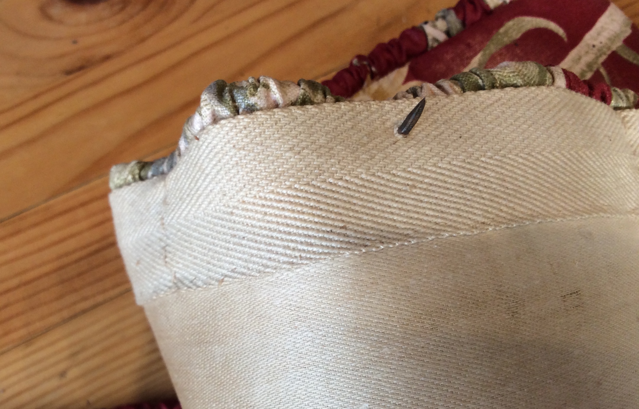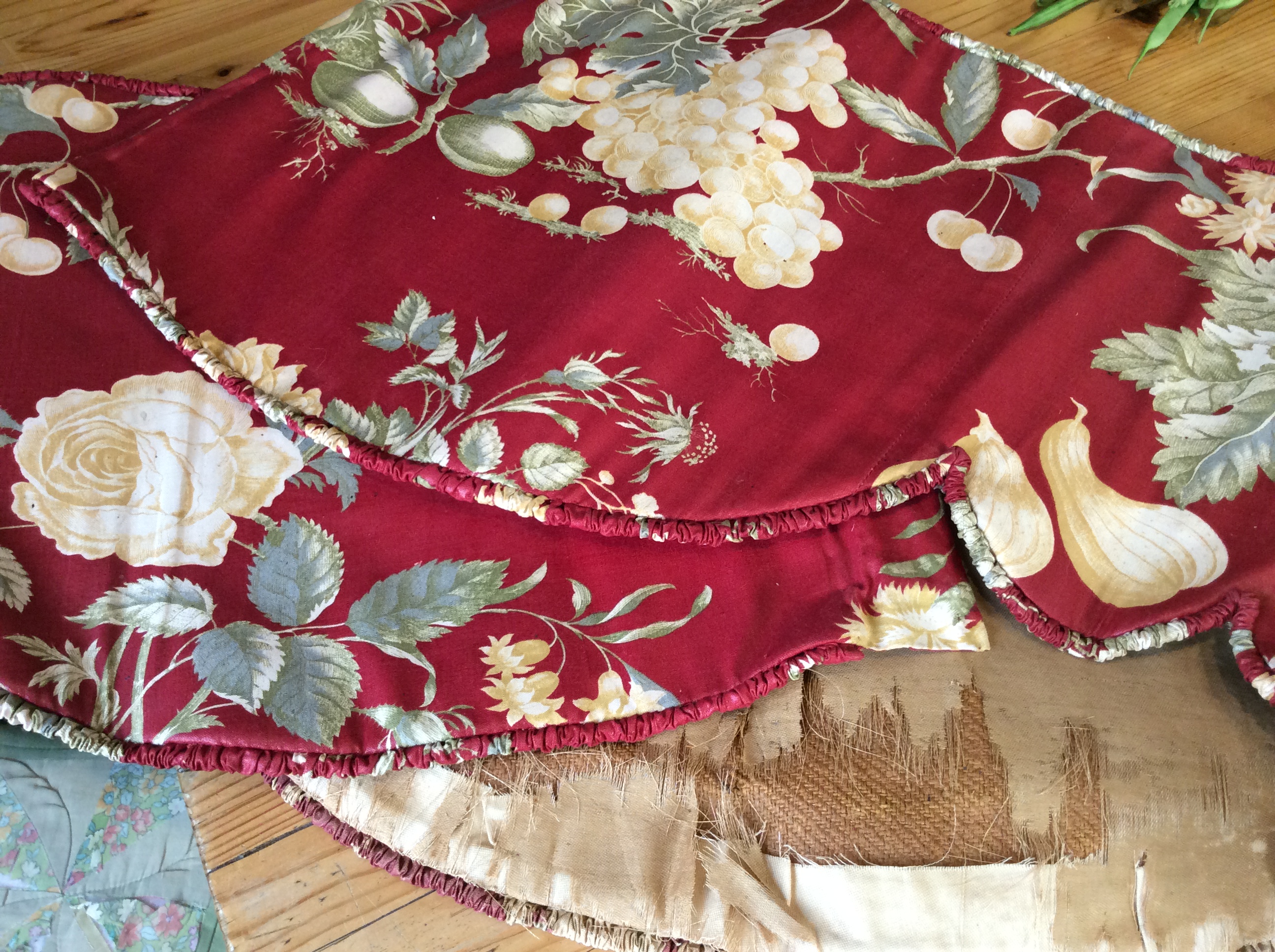 Creativity wins hands down! I went down to the recycling warehouse, thinking I quite fancied making a Japanese-style padded jacket out of old shirts, in the spirit of make-do-and-mend (see also my “Great Shirt Project“) to keep me warm around the house this winter, as the heating will only be on for a short time each morning & evening to keep the house from becoming damp, thanks to the enormous rise in fuel costs. I was rootling through the bins full of discarded clothing when a piece of red chintz quite literally bit me; it was an old curtain pelmet, complete with tacks still in place, as my poor scratched hand can testify. Underneath it I found another piece of pelmet, and two cut-off curtain ends, each about 18″/45cm by 6’/180cm. These had clearly been part of beautifully-hand-made and very expensive interlined curtains, probably in the 1970s; the cotton “bump” interlining was exactly what I needed for my jacket padding. But the chintz also spoke to me, and has ended up being the jacket lining & details, such as the cuffs, belt (I know, not in the original!) and pockets.