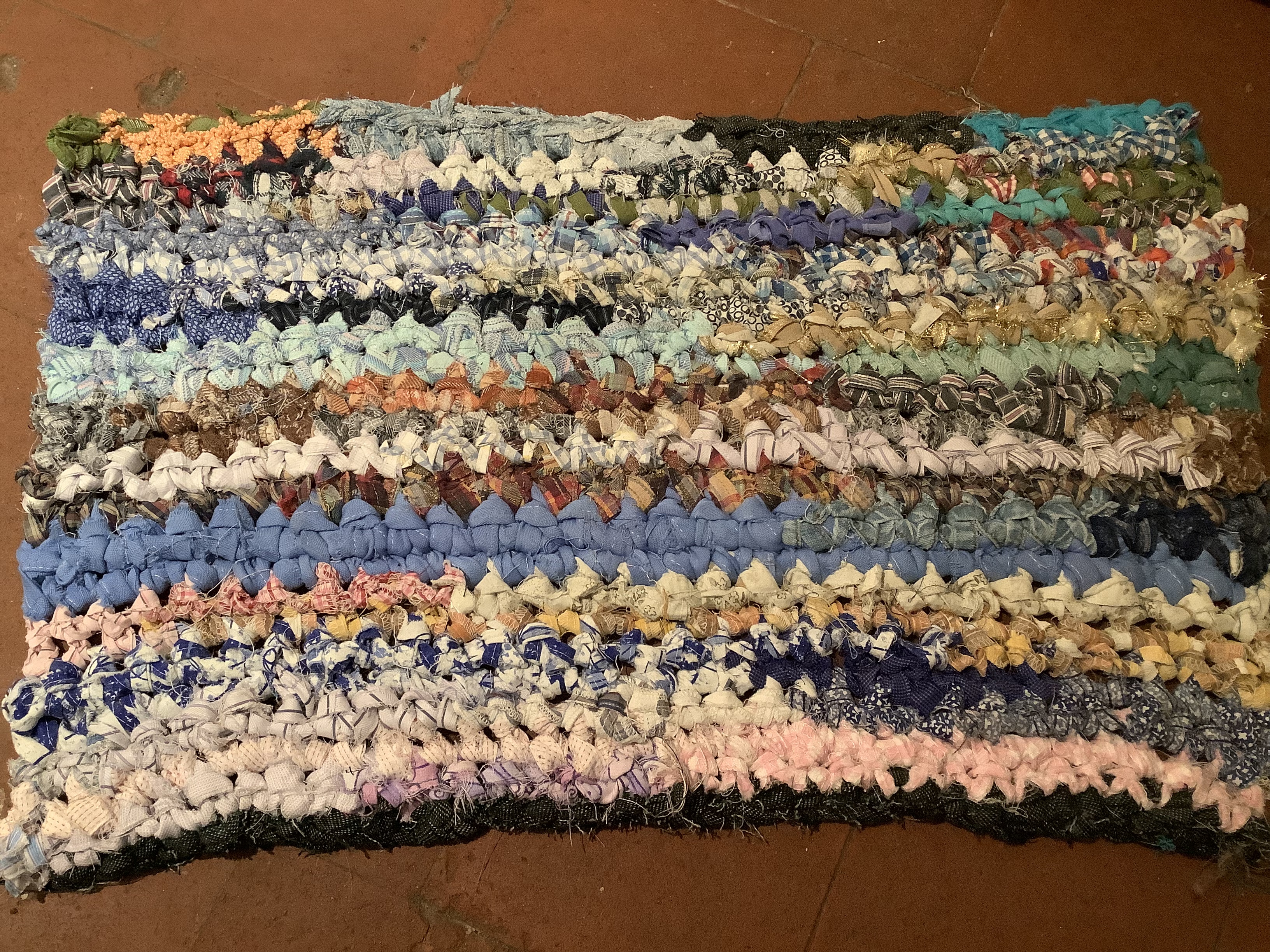 DD2 & I enjoyed a week in May and another in October house- & pet-sitting for our eldest in glorious Pembrokeshire, before the van started to play up so badly. The charity shops of Haverfordwest proved to be a very fertile hunting ground for materials for “upcycling” - which reminds me, I have far too many projects lined up already; did I mention the mess? – though I did make a couple of rugs whilst there. One in twined-weave (which now lives there) & the other giant-crocheted for a small-but-absorbent mat for our shower room.