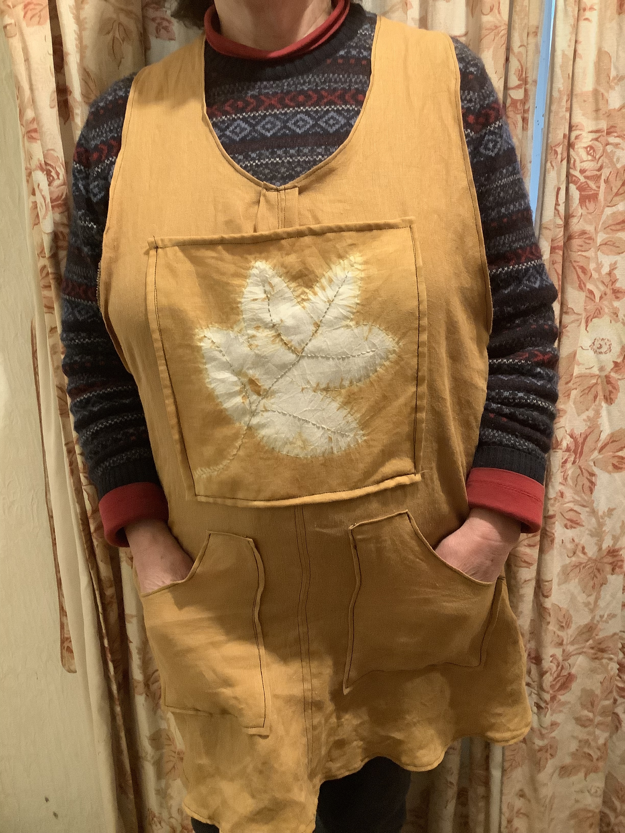 A couple of days ago, at the recycling warehouse, they had a number of large (2.5m x 1.45m) !KEA pure linen curtains in a mustardy brown colour; I paid 50p each for five of them. Four were pretty much pristine & went straight off the next morning with a re-enactor friend (“A perfect medieval colour! This stuff is about £27 a metre new!”) But the fifth has some biro marks in the centre, which haven’t washed out. So I’m making myself a Japanese-style cross-over apron from it, with BIG pockets, decorated with some shibori I did on a course last year that’s been waiting for the right project.