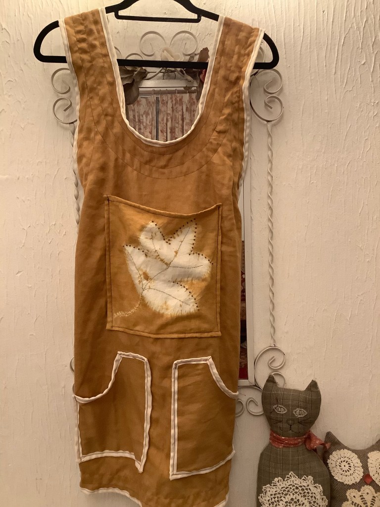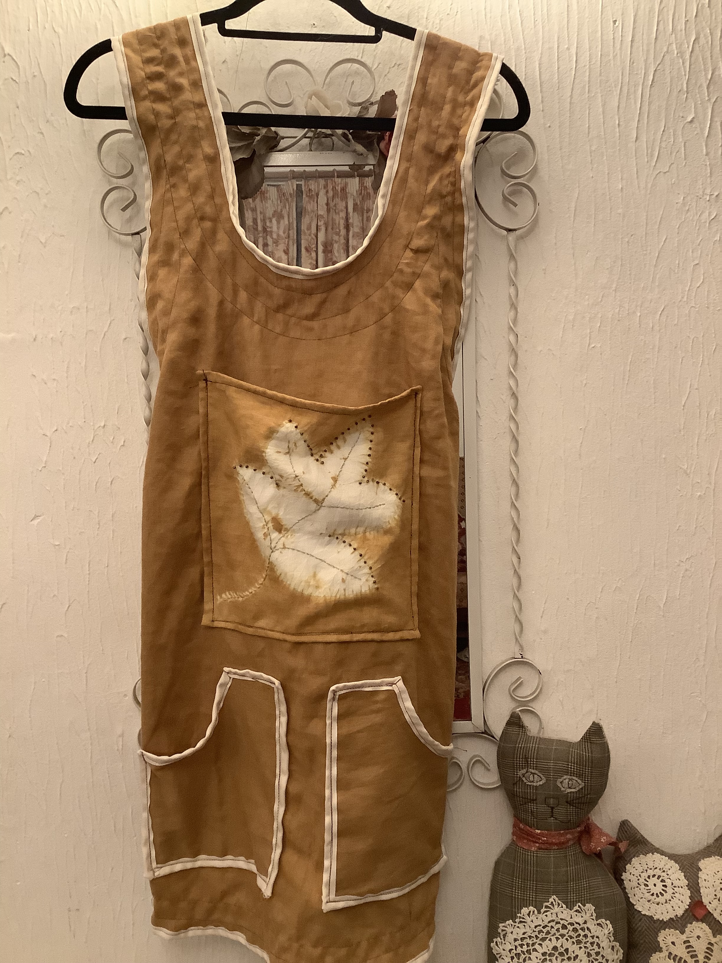 Luckily there was plenty of curtain left to cut out another one. I removed the shibori pocket from the first effort & adjusted the “pattern” a bit; made it a little longer & a bit narrower over the shoulders. Then fetched my 505 spray – this is a light spray-on glue, much loved by quilters for stabilising layers while you work – and smoothed the rest of the old curtain lining onto the linen, then cut it out, remembering to cut on the fold this time. I decided to leave the pockets on the first iteration and cut out some more from the left-over layered bits. Hemming the bits just seemed far too much like hard work, so I edged them with some herringbone tape left over from another project. I also stitched a few lines around the neck & straps, to keep the layers reasonably well together, knowing the pockets would sort out the lower half. Some beads & stitches found their way onto the shibori pocket, too.
