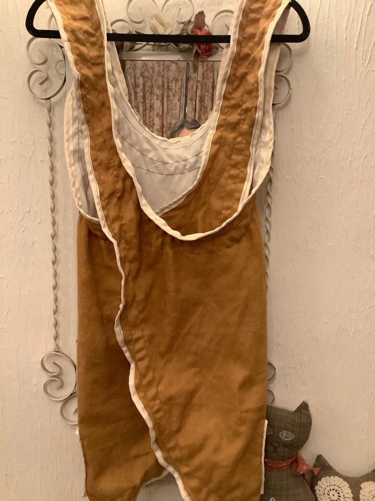 Needless to say, there’s a reason why I’ve never done anything much with linen before; it’s tricksy stuff. Quite open-woven, with tendency to fray like mad, and it creases in seconds unless starched, which would be a bit OTT for a working apron. (But I know that with use, it softens & drapes like almost no other fabric woven from natural fibres does. And under the right circumstances, it can outlast entire dynasties – see the pleated linen dress/smock in the Petrie Museum.) I was also not sure that I’d really got my head around how the aprons actually work, so I drew up a pattern on brown wrapping paper & made up a rough toile from an old curtain lining that was just hanging around in the sewing room (actually the spare bedroom) waiting for something useful to do. The various “patterns” & instructions garnered from other makers’ blogs & Y0utube do actually work & make sense, it’s just I can’t always “see” things in 3D straight off.
