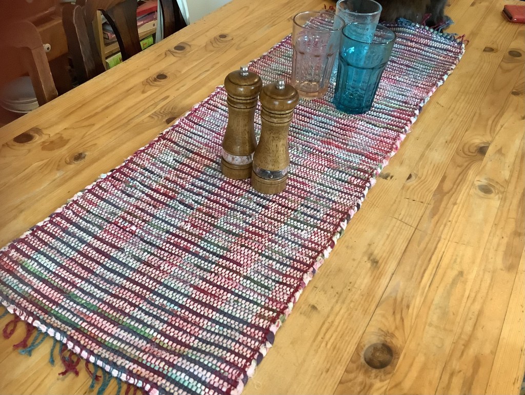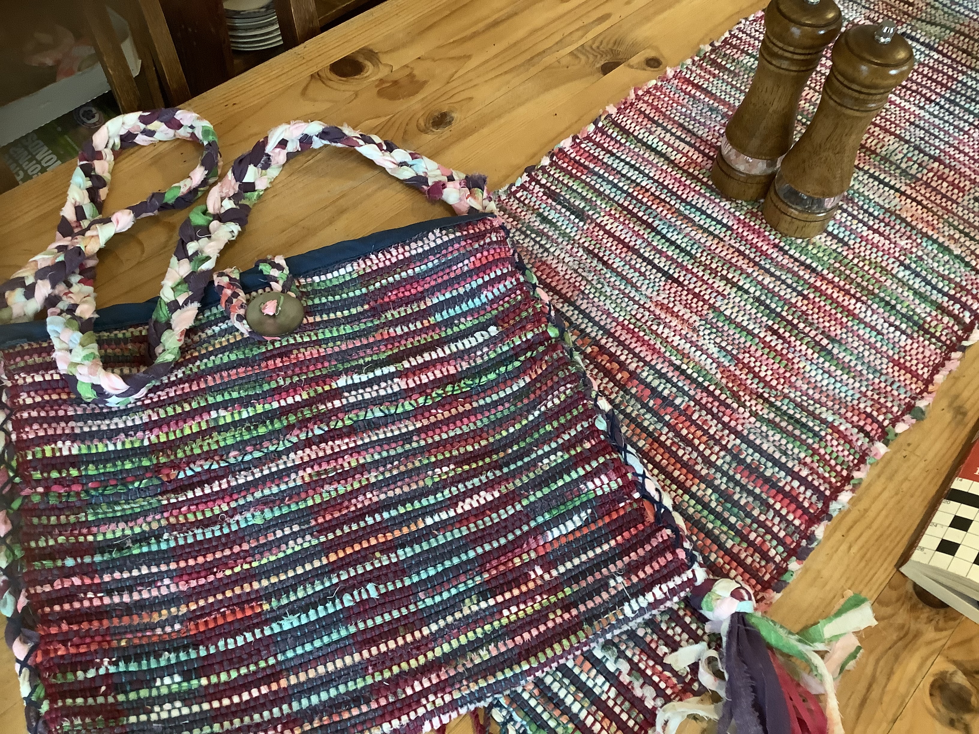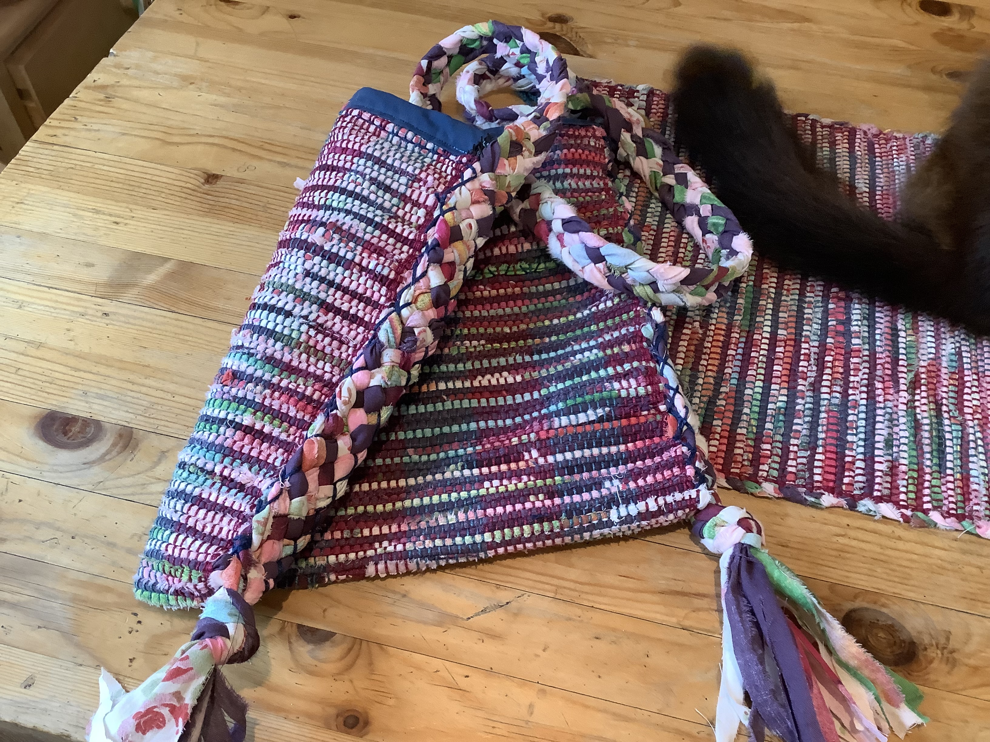 Although I warped the loom as I would my knitters loom, by running round the dining table and a tucked-in  carver chair, it somehow ended up several inches longer than the 6′ table! So I decided to cut it & use two thirds for the table runner (now about 4′ long) and one third to make a bag; I can always use another bag. The table runner is already in use, although I have yet to back it. Every mealtime I spot another mistake, but I love it anyway. As do the cats, needless to say… On the bag, I have “laced” in the row where one of the shafts had fallen out of play, hence only half of the warps are there; it will get hard use carrying various projects around, and that would form a weak point, so I decided to lace it down in a different colour to the two warp yarns. (I’ve used the same colour (blue) to stitch the handle on.) Once the table runner has a backing, I will probably stitch a pattern quilting-style over the weave to stabilise the other place where this had happened, and a few places where the shuttle had skipped a warp – it’s likely I was nattering, not concentrating!