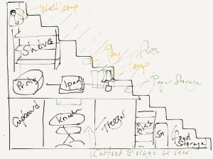 Our hallway is long & narrow; it runs the full length of the house from front to back door, straight through the middle, and is very much a passageway in continual use. The stairs run straight up from outside the living room door, near the front door, with no turns. So the area under there is quite a good size, but obviously long & thin, low at one and and high at the other. For many years we had a tall freezer at the high end, near the kitchen door, but some months ago I worked out that half the stuff we were expending electricity on keeping frozen was actually junk. So I replaced it with a worktop-height one; there’s also a big chest freezer out in the garage, so all we needed was a bit of cold storage for frozen veg & ice cream indoors. This opened up some intriguing possibilities; if we could just work out how, the space could probably be put to better use. The rest of it had some freestanding shelves & no obvious function, so had filled up with fairly random & long-forgotten clutter.