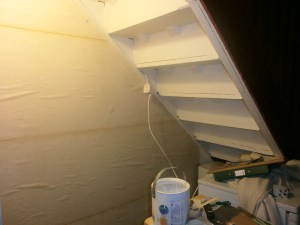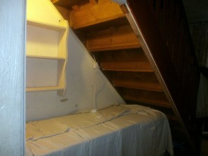 But there’s quite a lot of work to do. I need to sand down, prime & paint the underside of the stairs. Then clean, size & line the walls, hang the paper, and lay the flooring. It’s not a big area; each job will probably only take a few hours, but will get in everyone’s way mightily as I’ll have to haul everything out of the space in order to work in it! So in my mind it’s become The Rainy Day project; I will start each “phase” at a time when I’m likely to be able to finish it without being distracted or dragged out to do something more interesting. I’ll be taking photos along the way to document my progress, and my ambition for this project is for it to be 100% “re-purposed” i.e. using stuff that we already have, or other people don’t want, and to complete it without spending any money at all!