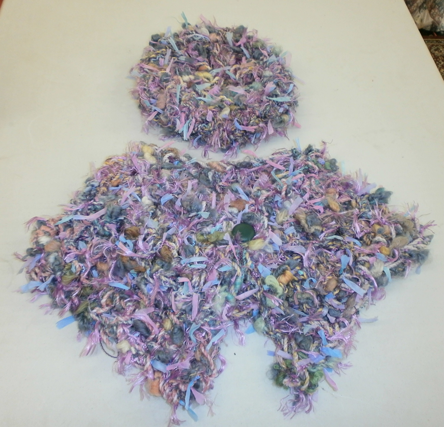And here’s another pattern – this time for a collar that can be made to match the hat. It’s even simpler as there are basically only two stitches involved, but if you get the right mix of yarns, quite stunning. To make both together, you will need a minimum of 85 yards of each yarn. I have used three yarns for the example, a chunky (James C Brett’s Marble Chunky) an eyelash (Sirdar’s Fizz) and an unkown slubby thick & thin purchased at a charity shop, wound into the sort of random-sized balls that suggest it was from an unpicked project, though it’s actually quite difficult to unpick. As with the hat, I will do both UK English & American English instructions as the Ravelry Fingercrochet group has members from both continents – and possibly others too!