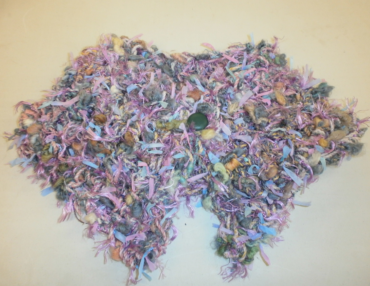 Repeat from * to * until it’s long enough, then fasten off & weave ends back in. Sew one or more big buttons on to fasten; your stitches will be big enough to use as button holes.