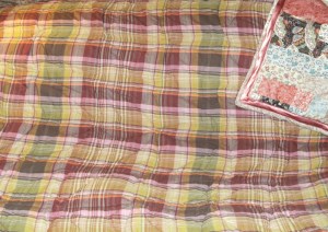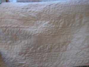 It took a lot longer to quilt this one; it’s much more closely quilted. I chose to more-or-less echo the shapes of the rectangles and their overlaps. So if quilts got names, I’d call it “Corners” as I turned an awful lot of those! But the joy of working on an old-fashioned treadle is total control; it never runs away with you. Anyway, by this morning I was very nearly there…
